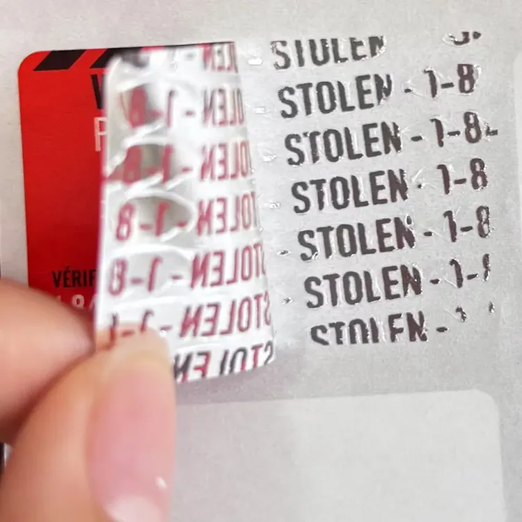 3. Etichetta anti-banco di supporto svelata :È anche un'etichetta anti-manomissione una tantum. Quando l'etichetta viene aperta , un modello o un testo specifico verrà lasciato sul livello inferiore , indicando che l'etichetta è stata aperta e impedendo che venga riutilizzata , aggiungendo un ulteriore livello di sicurezza per il prodotto. Ad esempio , dopo essere stato aperto , può visualizzare le parole "aperte" o il modello specifico del marchio.