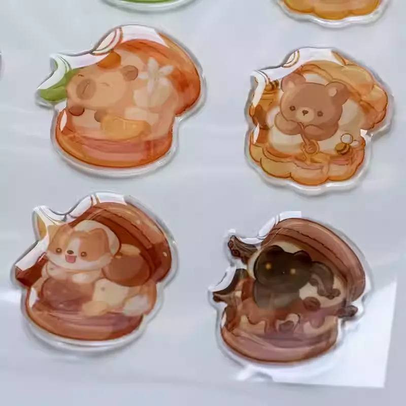 Gli adesivi epossidici dei cartoni animati forniscono una lucentezza liscia e lucida che amplifica la vivacità e la chiarezza. Questa superficie lucida riflette la luce, rendendo i disegni stampati più vividi e professionali.