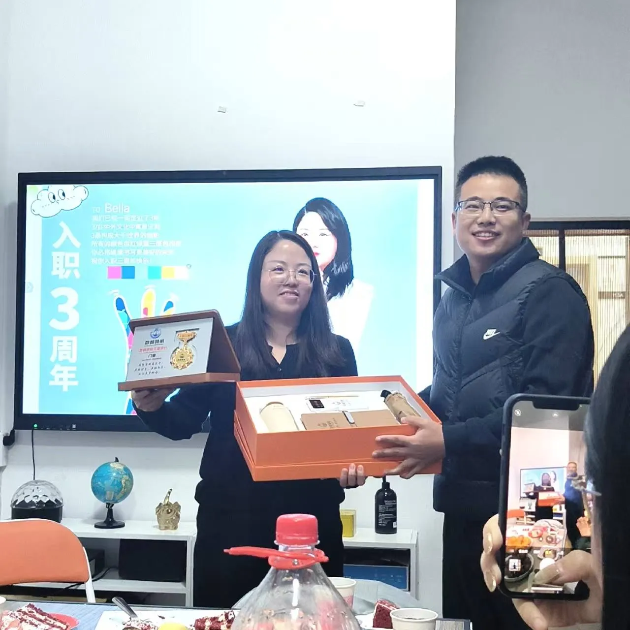 Come meravigliosa sorpresa, il capo Gao ha anche presentato personalmente bellissimi regali di anniversario di lavoro a Tom ed Ella e alla direttrice Bella. Questi gettoni speciali sono un sincero riconoscimento del loro contributo negli ultimi anni e portano i nostri migliori auguri per la loro continua crescita con l'azienda.