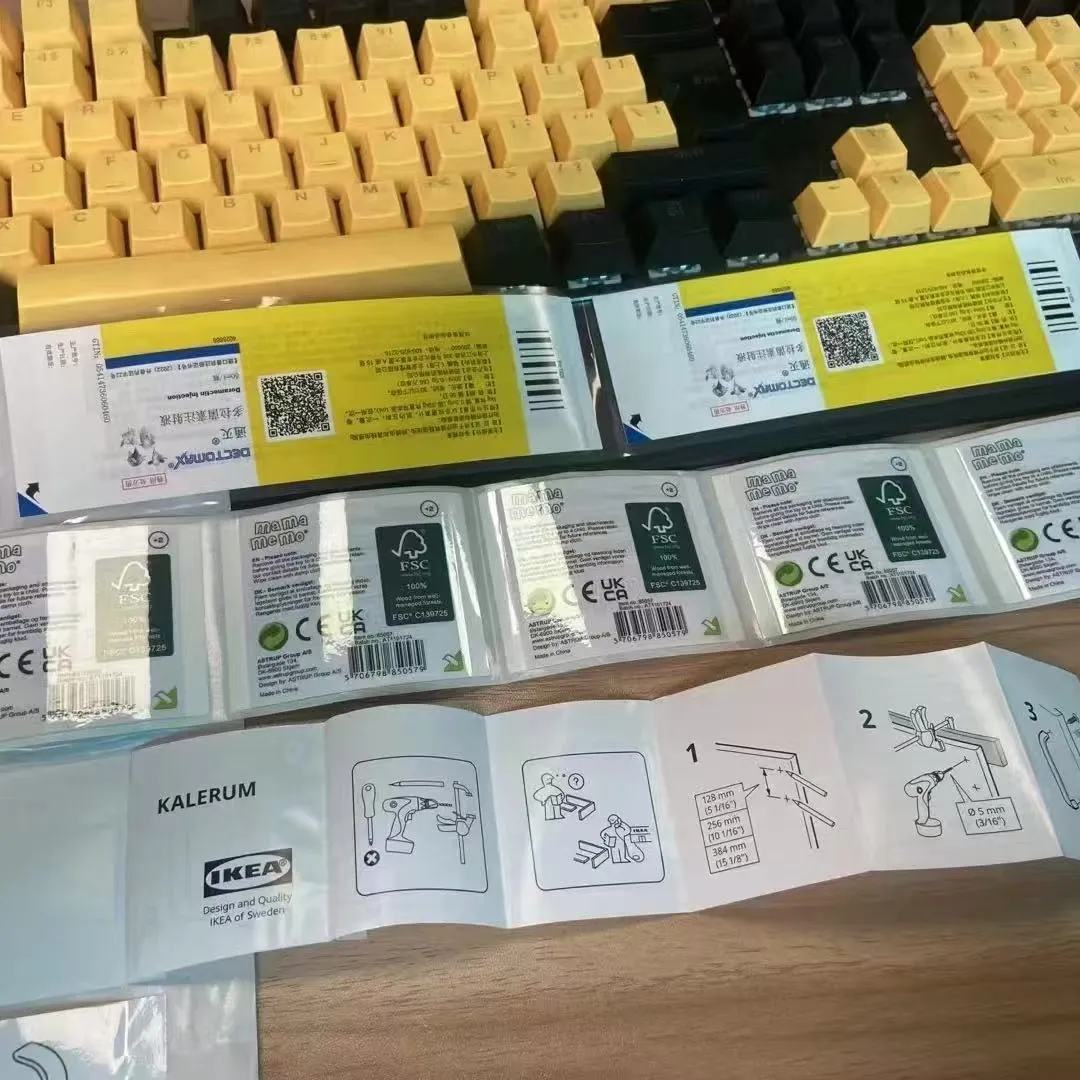Le etichette piegate sono solitamente un lungo adesivo con adesivo su un lato e il resto piegato. Una volta aperto, sembra un mini libretto. Quando si tratta di etichette piegate, la parte inferiore rivestita di adesivo viene attaccata al prodotto, quindi la parte superiore viene piegata per coprirlo. Gli utenti devono aprirlo manualmente per vedere le informazioni nascoste che sono ripiegate.
