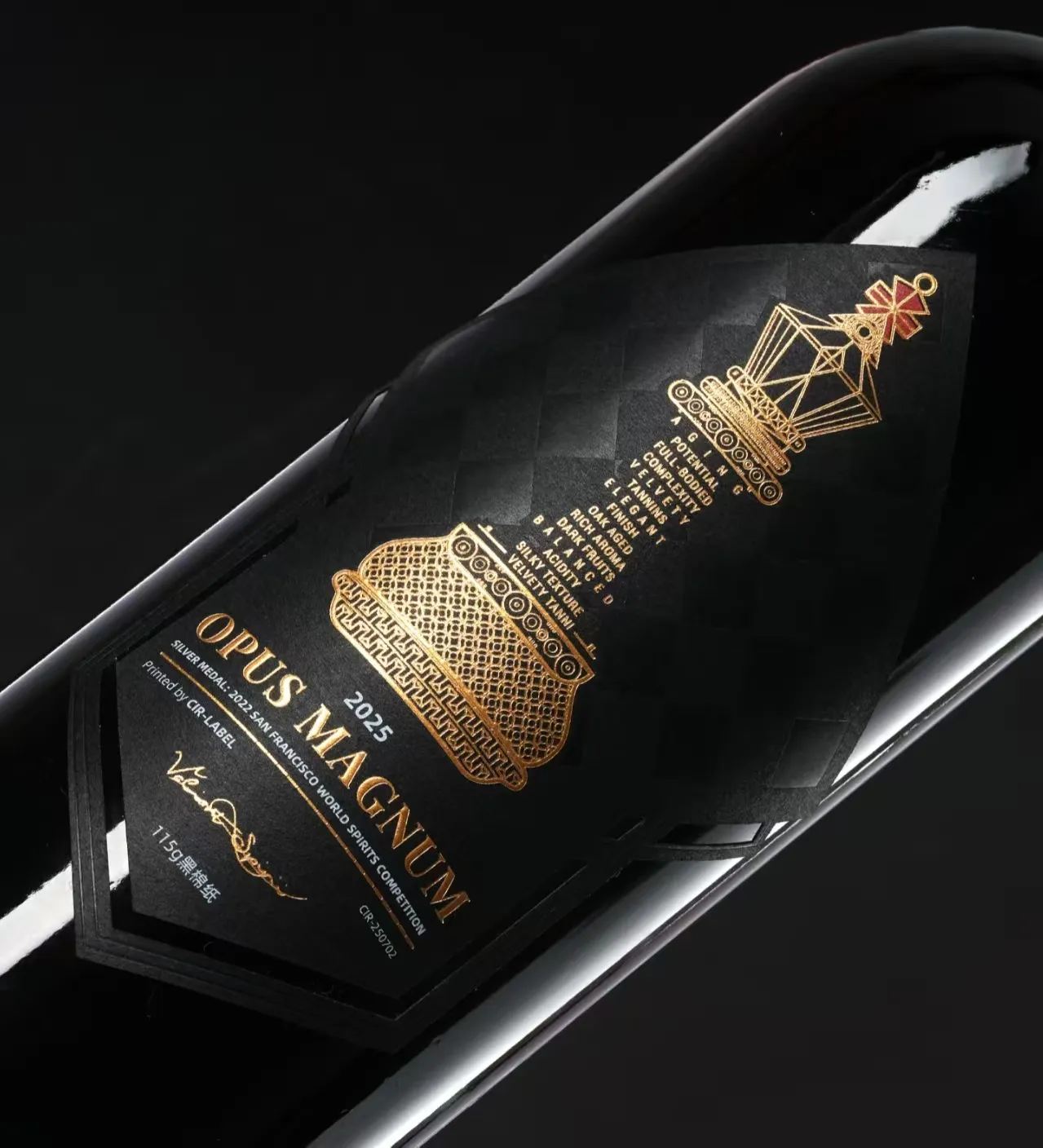 Questoetichetta del vinopresenta un'ampia stampa in lamina d'oro. Lo sfondo nero è abbinato a motivi a linee dorate, mentre il testo utilizza una combinazione di oro e bianco. La luminosità dell'oro e la brillantezza della stampa a caldo, insieme ai motivi e al testo leggermente in rilievo, creano enfasi e una stratificazione chiara, conferendo un'estetica classica ed elegante.