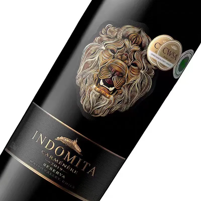 Questoetichetta del vinoutilizza un design diviso. La parte inferiore presenta una trama di sfondo lineare, mentre il testo, il castello e i bordi superiore e inferiore sono stampati con una lamina d'oro color rame antico. La texture e i colori sfumati della testa del leone aggiungono lucentezza ed effetto 3D, facendo apparire l'intera etichetta radiosa sotto la luce e attirando l'attenzione dei consumatori.