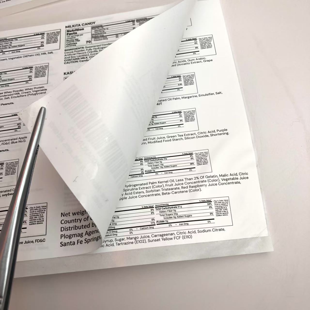 Le etichette a 2 strati degli integratori vengono realizzate stampando le informazioni sugli integratori sanitari su etichette di carta di diversi strati. Strati di silicone e strati adesivi sono rivestiti sulla carta di rivestimento e su ciascuno strato di carta per etichette. Quindi, queste carte per etichette multistrato vengono laminate, impilate e fustellate nella forma finale.