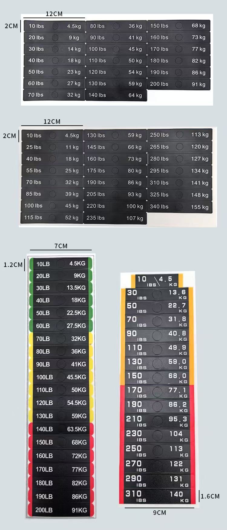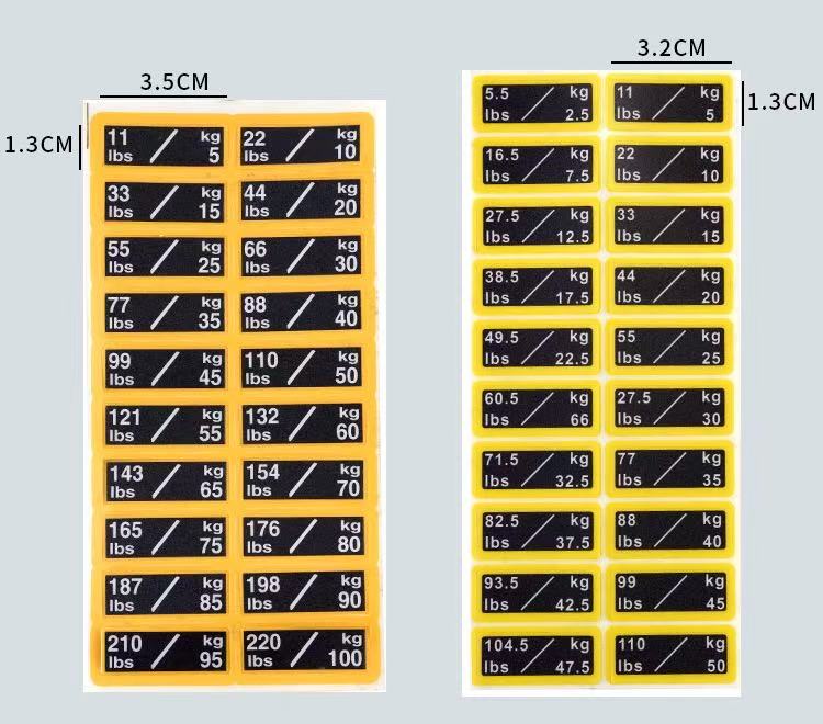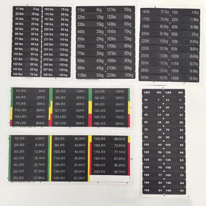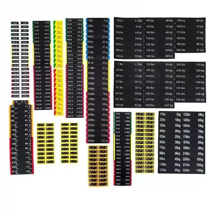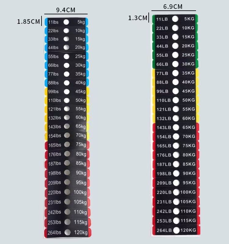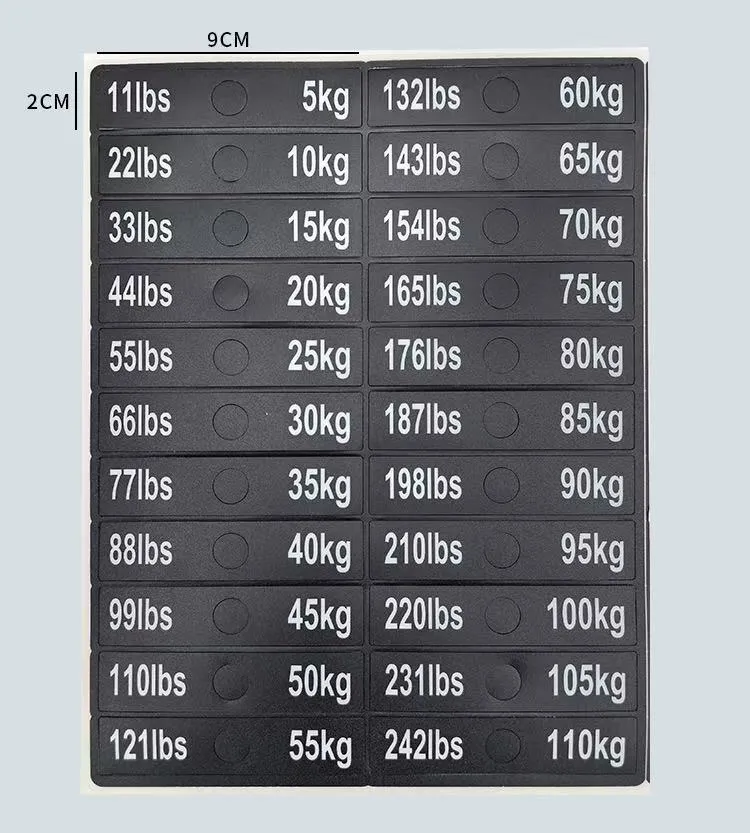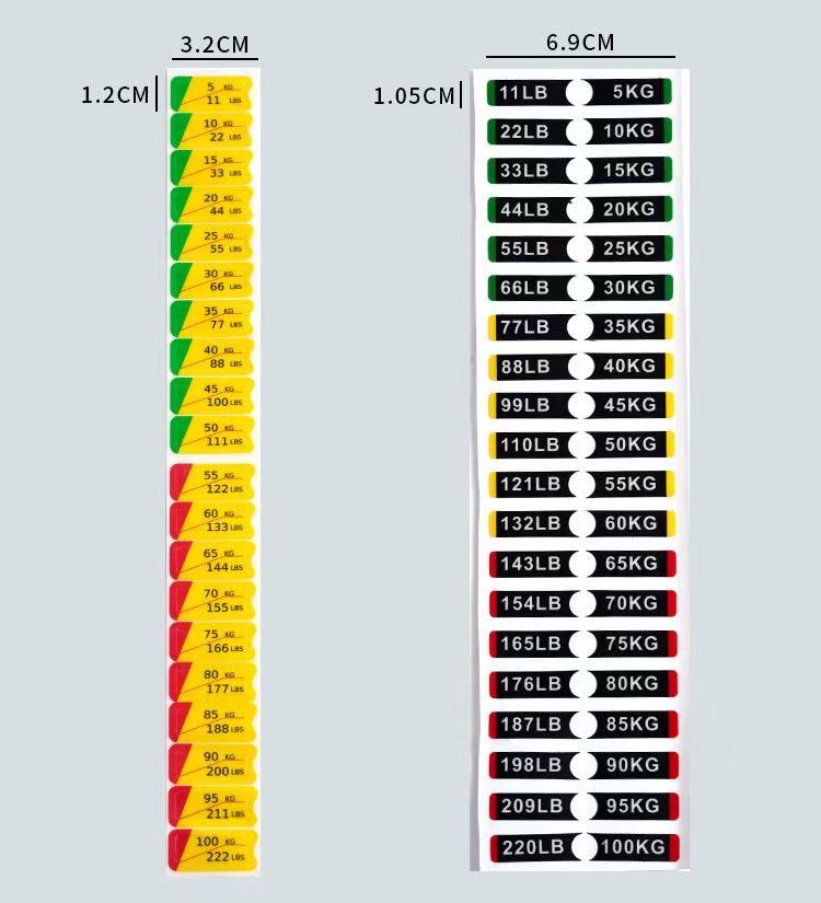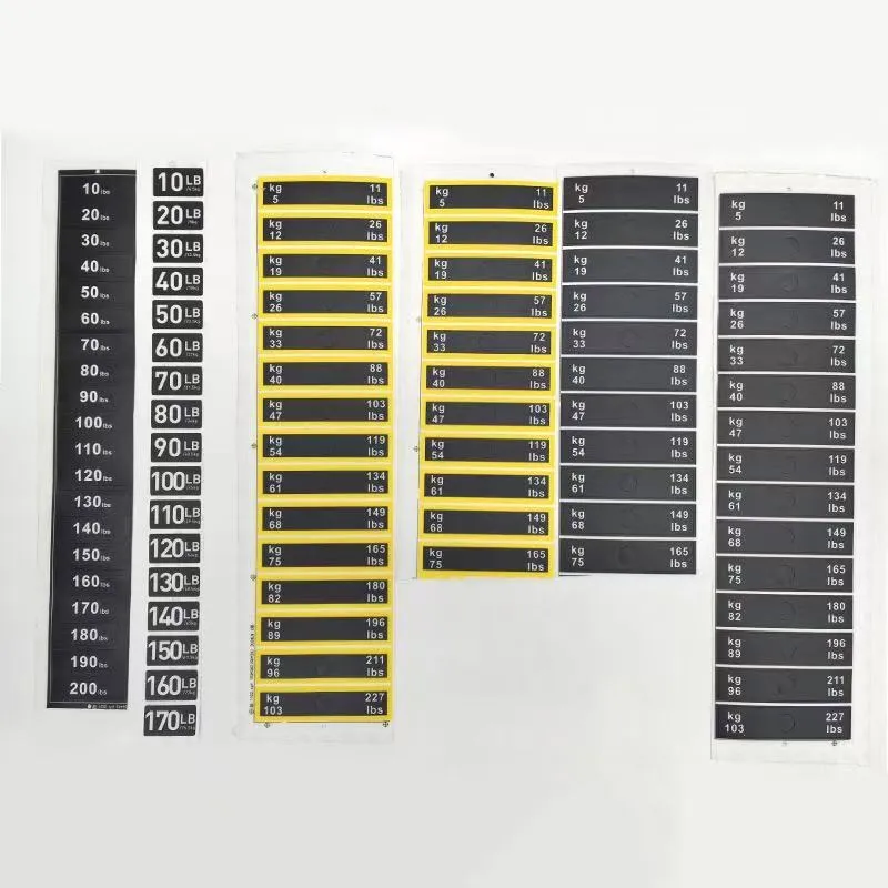 Questi adesivi per pesi per blocchi pesi per attrezzature da fitness sono un tipo di adesivi identificativi appositamente progettati per etichettare il peso degli attrezzi da fitness. Solitamente sono realizzati in materiale PVC e puoi fare riferimento alla tabella dei parametri del prodotto per dimensioni specifiche. I valori del peso sono chiaramente indicati sugli adesivi, consentendo agli utenti di identificare e selezionare rapidamente il peso di allenamento appropriato.