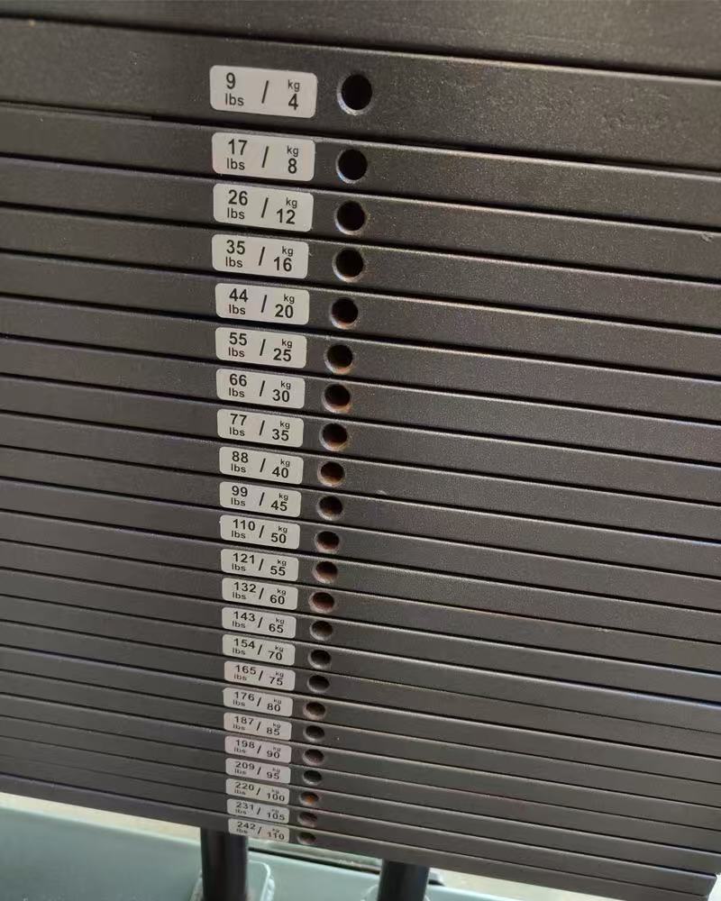 Ogni adesivo è chiaramente contrassegnato con i valori del peso, consentendo agli utenti di identificare e selezionare rapidamente i blocchi di peso adatti alla propria intensità di allenamento ed evitare di pesarsi frequentemente durante gli allenamenti.